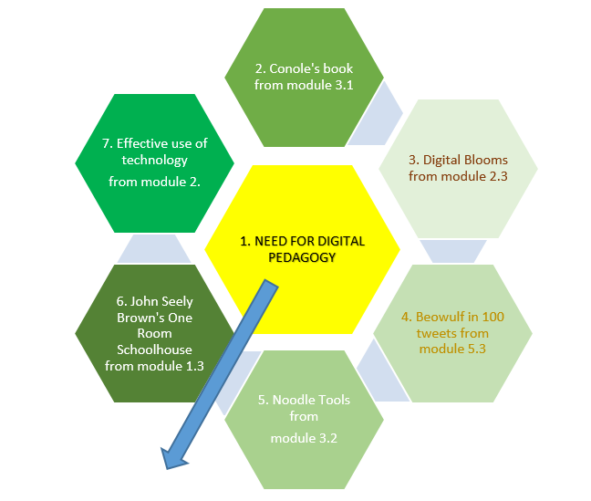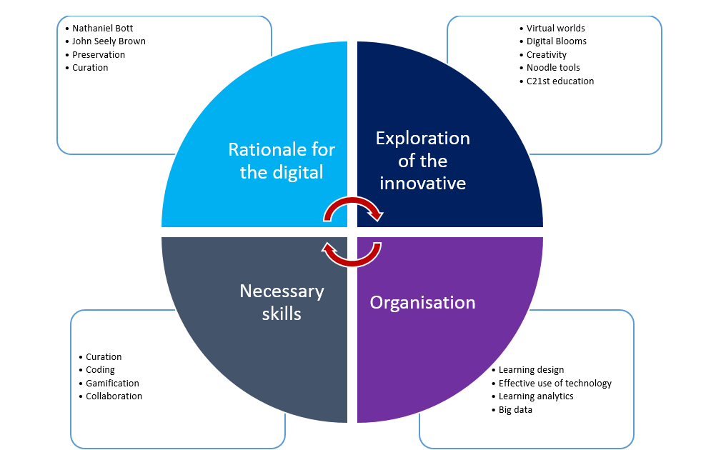 Each segment draws together my learning from the subject modules.. The interweaving and interaction of the various topics has combined into a powerful ideology of knowledge networks and digital innovation applicable to my practice. The pedagogy within each module has been delivered in a multimodal manner, where the modality has resulted in an ensemble of connected parts, in comparison to the linear mode of traditional academic discourse (Kress, 2010, p. 93).
