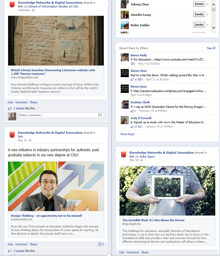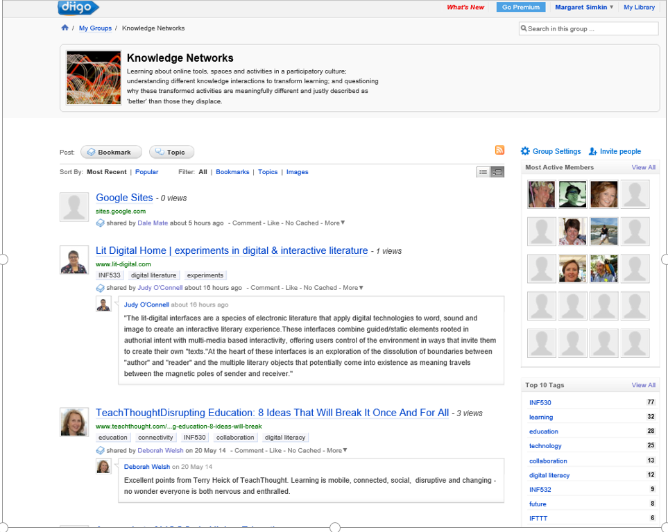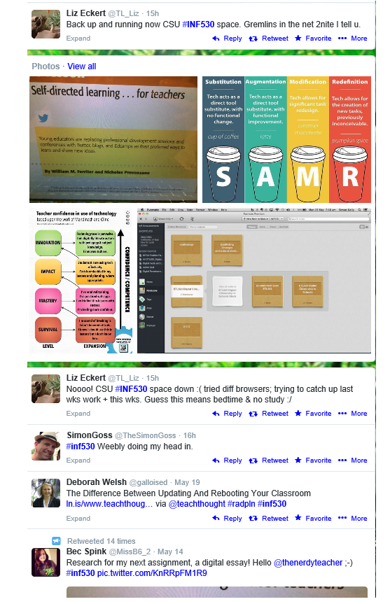 The practical application our learning has resulted from participatory practice: blogging, forums and collaborative curation. The subject has enabled transfer of developing skills to the range of work places represented by the student body. The power of the INF530 professional learning networks can be demonstrated by these screen shots of our networked practice: