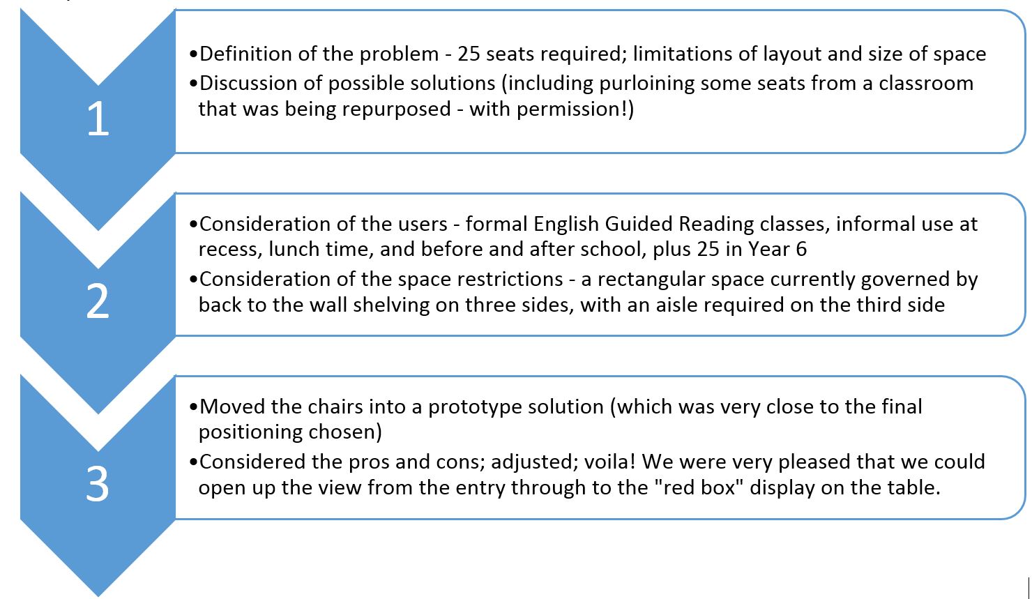 The result has been well received by almost everyone, with the most enthusiastic being the students (even the older students who can be conservative about changes to their space!). As each class has come in for a lesson, the seats in the middle of the space have been first occupied. There has only been one negative comment, from a Mathematics teacher who was taking a reading class for an absent teacher. He thought the students had been messing things up! He condoned the change once I explained that we had done it and why.
