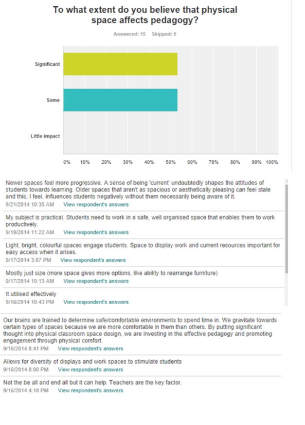 From early in the course it was obvious that design did matter but articluating why and deciding which of the different definitions of design was challenging and a fluid situation arose in terms of resolving personal opinion. It is is only through empirical research that the impact of space on pedagogy can be unequivocally appreciated (Walker, Brooks, & Baepler, 2011).