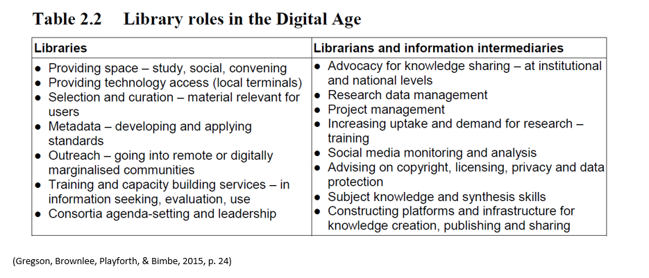 It is the human capacity of libraries that is critical: staff who are knowledge intermediaries, teacher-librarians, and information and data scientists. Such people work at the junction between development, information science and governance (Gregson, Brownlee, Playforth, & Bimbe, 2015, p. 6).