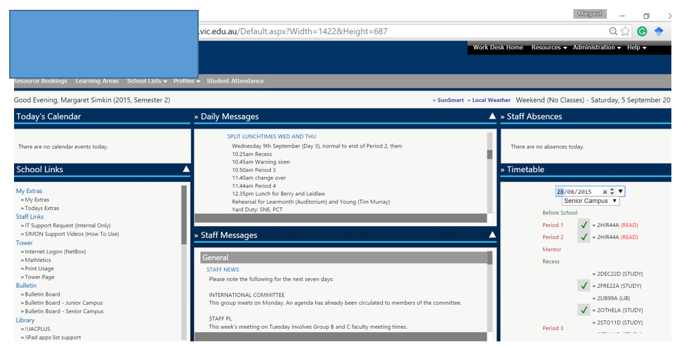 Colloquium Two, led the group in a very different direction, and eventually led to my case study. Simon Welsh, who made learning management systems (LMS) come alive, and raised the spectre of an interesting future (Simkin, 2015 b). Attending with a dubious attitude, it was a chastening reminder not to prejudge content. The chat comments from my peers furthered the discussion and added intriguing elements and a degree of humour which became integral to this mode of learning. Simon’s words certainly provoked re-evaluation of my use of the school LMS and make comparison with other systems and academic research (Simkin, 2015 h).